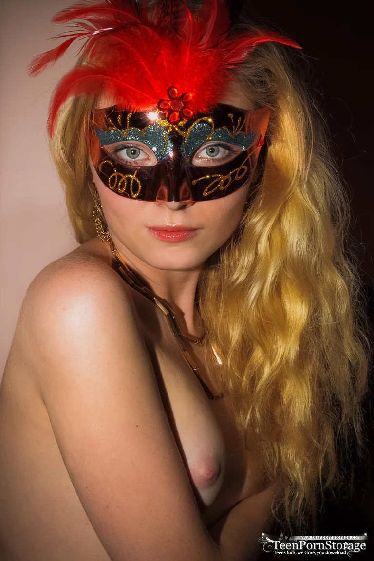 Молоденькая любительница Мила снимает свою маскарадную маску, показывая свою лысую щелочку